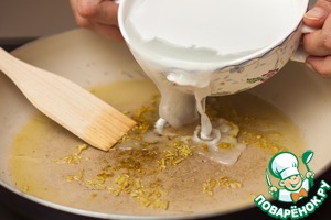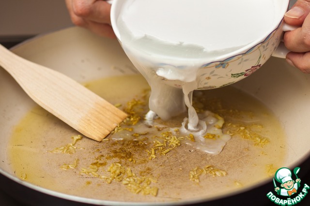 Вливаем кокосовое молоко*, добавляем щепотку соли и выпариваем молоко на сильном огне около 2-х минут, помешивая.