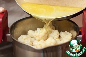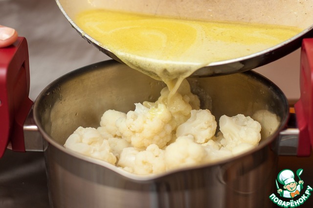 Сливаем воду с цветной капусты и вливаем пряное кокосовое молоко.