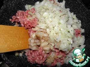 Обжарить на сковороде мясной фарш, лук и грибы до готовности.. Посолить, поперчить по вкусу. В конце добавить зелень и перемешать.