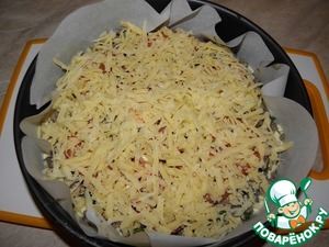 Накрыть форму фольгой. Если форма стандартного размера для пиццы, то поставить в духовку на 25-30 минут. Если форма меньше, то минут на 40- 45.