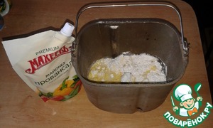 Дрожжи, муку (пшеничную и кукурузную), соль, сахар, майонез и воду закладываем в ведерко хлебопечки на режим "Тесто".