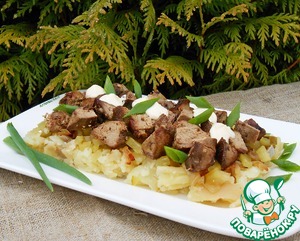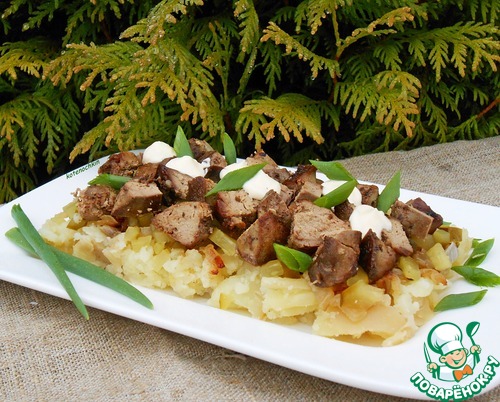 На картошку выложить обжаренный лук, соленые огурцы, сверху – кусочки печени.