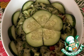 По желанию можно добавить нарезаный соленый огурчик - тоже ну очень вкусно получится. Даем салату настояться, пока варится рис. -