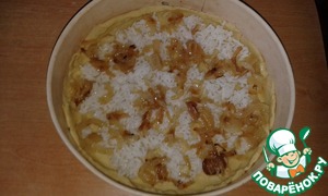 Для начинки сварить рис, лук и картофель, нарезанный тонкими пластинами, обжарить по отдельности на растительном масле. Яйца сварить вкрутую и порезать кубиками. Сыр натереть на терке. Охлажденное тесто разделить на 2 неравные части. Большую часть раскатать по размеру форму и уложить, формируя бортики