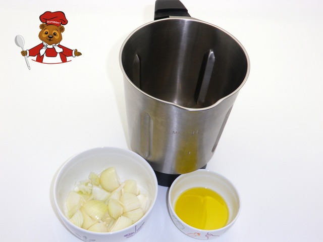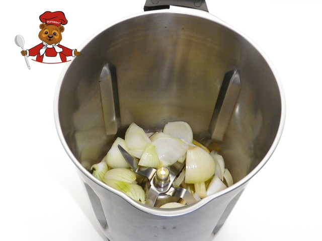 Поместите лук в миксерную чашу и измельчите за 10 секунд в режиме "Блендер" на 4-ой скорости.