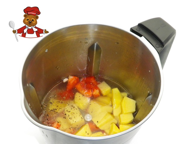 Поместите в миксерную чашу порезанные кубиками сладкий перец и картофель, добавьте воду, соль и перец.