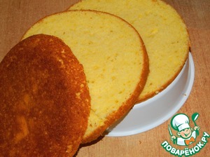 Готовый бисквит остужаем и разрезаем на 3 коржа.