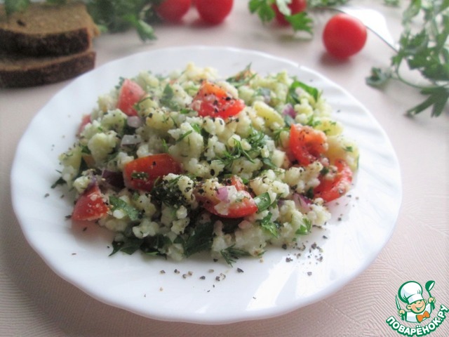 По-летнему яркий, сочный по вкусу, почти "Табуле", но из пшена... Салат из Золотого пшена "Мистраль" с овощами и миндальным орехом.