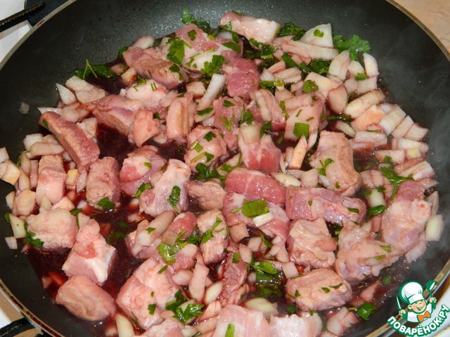 Обжариваем свинину в вине с добавлением лука, чеснока, петрушки, соли и перца. Когда вино выпарится, можно подливать немного воды, пока мясо не станет мягким.
