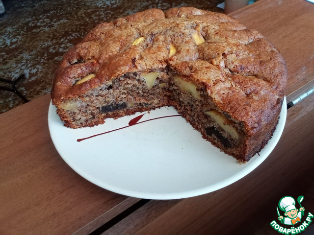 Готовила в форме 22 см. Орехи и чернослив положила прямо в тесто, ещё добавила 1 ч. л. разрыхлителя и немного корицы. Было 3 небольших яблока. Всё утонуло и легло слоями. ) Выпекался при 175 около часа.