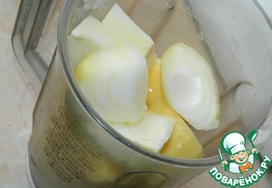 Взбиваем в блендере очищенный картофель, чеснок и лук до состояния пюре (чтобы лучше взбивалось, можно подлить немного молока).