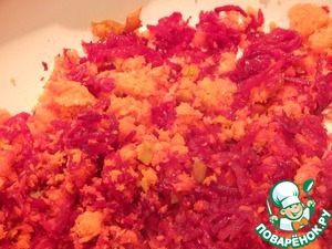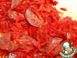 Добавляем клюкву и порезанные колбаски, перемешиваем. Начинка готова.