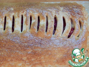 Сверху накрываем вторым пластом теста, края защипываем. Убираем в нагретую до 190 духовку минут на 25-30 в зависимости от духовки. В конце выпекания смазываем желтком.