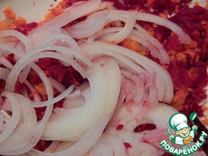 Затем, продолжая обжаривать добавляем лук, порезанный полукольцами.