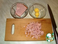 Подготовим начинку для наших закусочных тортиков. Возьмем 2 отваренных куриных желтка и ветчину.