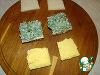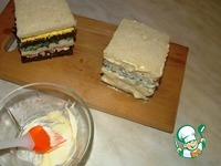 P.S.: Такие закусочные тортики вполне можно приготовить большого размера, увеличив количество ингредиентов. Для такого торта нужно взять по большой булке белого и черного хлеба, обрезать корки и разрезать вдоль на пласты по 1 см толщиной.