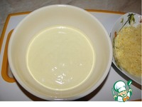 Подготовить тесто: взбить яйца с майонезом, сметаной и щепоткой соли, добавить разрыхлитель теста и затем постепенно добавить муку. Все хорошо перемешать.