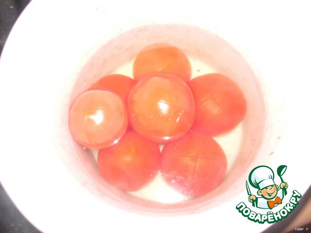 • Надрезал помидоры и залил кипятком на минутку. Снял кожицу с помидоров, достал мясорубку