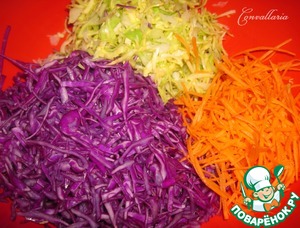 Краснокочанную и белокочанную капусту тонко нашинковать и по отдельности помять руками.
