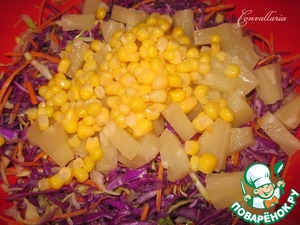 В глубокой емкости соединить капусту, морковь, кусочки ананаса и кукурузу. -