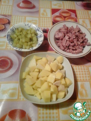 Сервелат, очищенные огурцы и картофель нарезать кубиками.