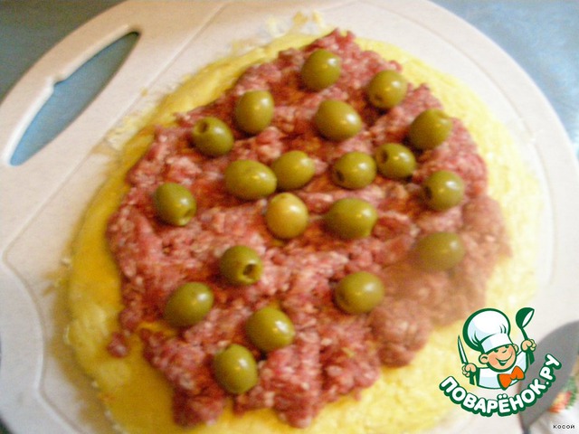 Снимите корж с бумаги и сверху разложите фарш со специями и солью. Положите слой оливок.