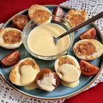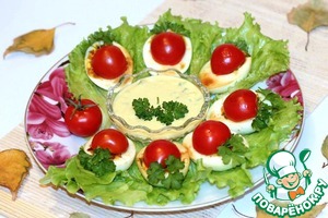 Перенести яйца на блюдо. Полить соусом сверху, вокруг и украсить. Я украсила зеленью и помидорками черри.