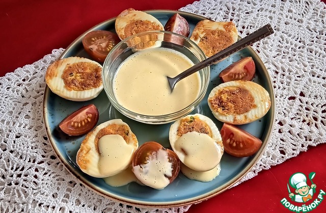 Нафаршировать яйца желтковой смесью, оставив примерно 2 ст. л. - для соуса)))