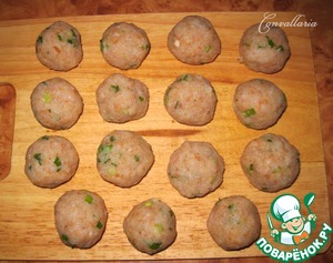 Из рыбного фарша сформировать влажными руками небольшие шарики (размером с грецкий орех), выложить на доску и убрать в холодильник на 10-15 минут.