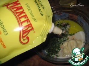 Для соуса смешать сливки, майонез, зелень, горчицу, выдавленный через пресс чеснок, оливковое масло, соль и молотый перец.