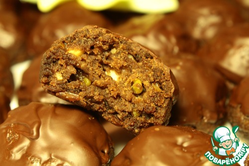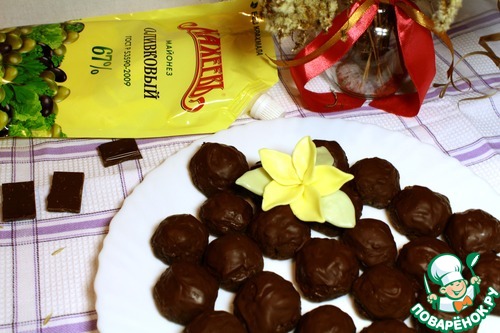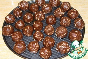 Все продукты соеденить и разделить на 40 равных частей. Насыпать горку муки. Каждый шарик вымешать вмуке (тесто возьмет столько муки сколько ей надо). Скатать в шарик и в духовку. Дальше приготовить глазурь (сахар 1стак, молоко 5 стол. лож, масла 50гр, какао 4-5 лож). Готовые шарики обвалять в глазури и посыпать терыми вафельными коржами. Рецепт получен в 1983 году.