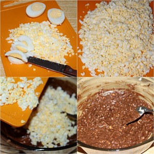 Вареные яйца мелко, мелко порубить или натереть на мелкой терке. Добавить в массу и тщательно перемешать.