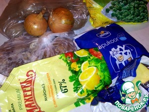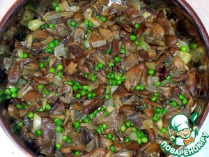 ( Ингредиенты. ) Очистить картофель, положить в мультиварку, налить воду и варить. Пока картофель варится, займёмся грибами. Размороженные грибы пожарить с луком на подсолнечном масле. За 5 минут до готовности в грибы насыпать горошек.
