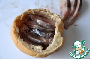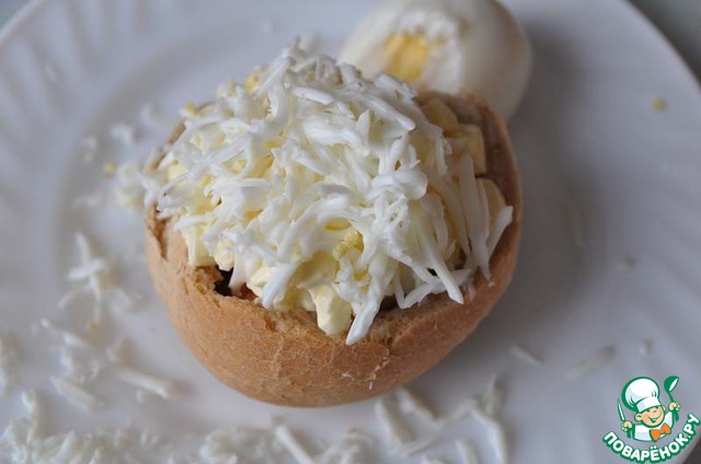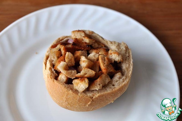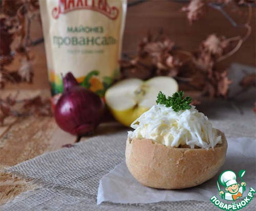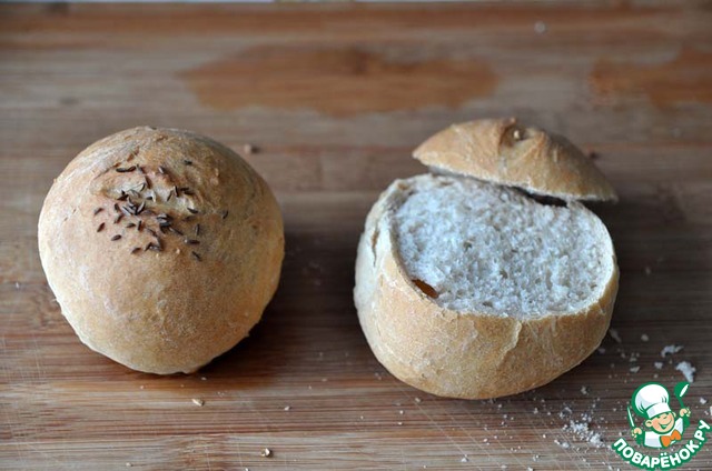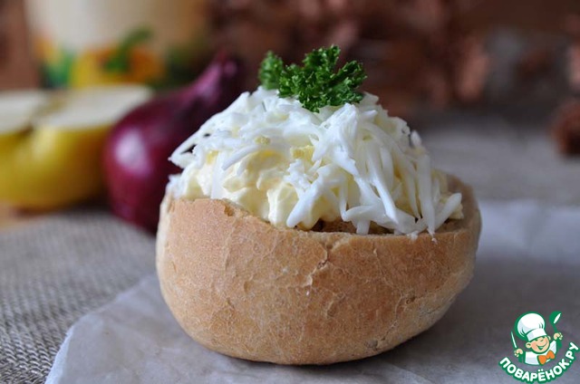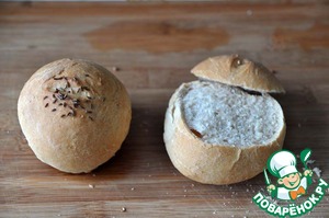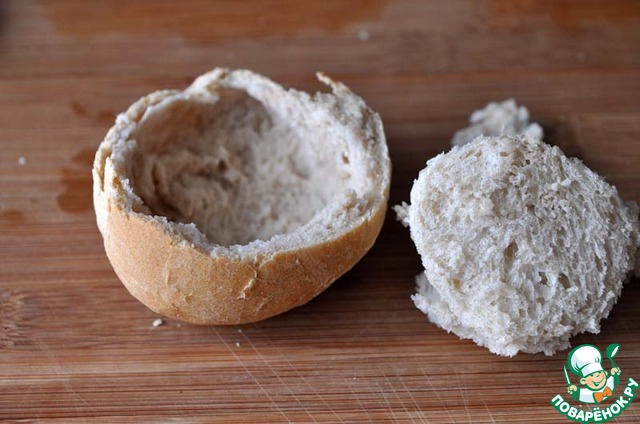 Эту закуску можно готовить порционно, используя булочки ржаные или ржано-пшеничные. А можно готовить в буханке ржаного хлеба.
