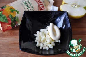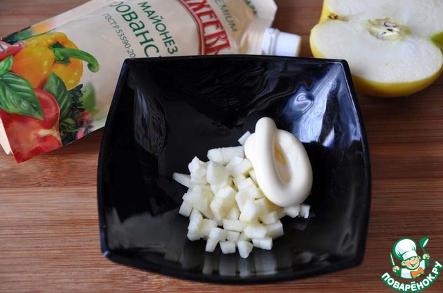 Яблоко чистим, режем на мелкие кусочки и смешиваем с майонезом.