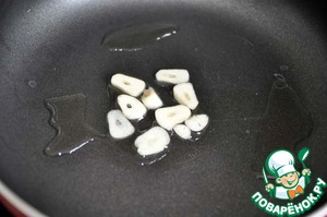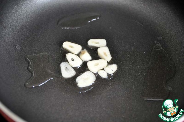 Чеснок режем на пластинки и обжариваем на растительном масле.