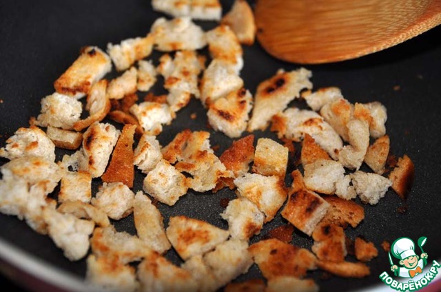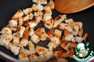 Убираем чеснок и обжариваем в чесночном масле мякиш - делаем сухарики.