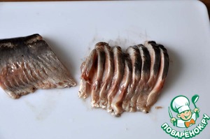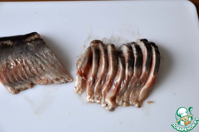 Берём малосолёную сельдь, у меня собственного посола, чистим, разделываем на филе, режем тонкими пластинками.