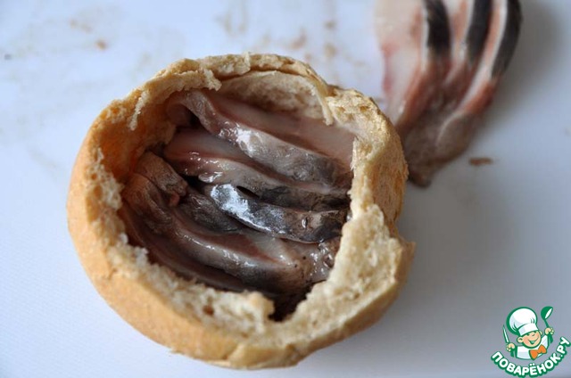 Я делала порционно в ржано-пшеничных булочках с тмином собственной выпечки.