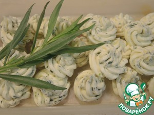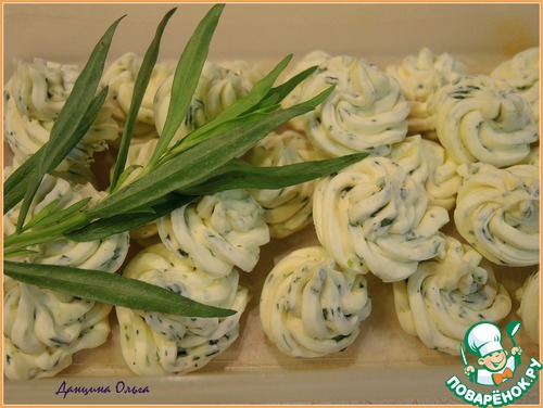 Приготовить эстрагоновое масло. У эстрагона оборвать листики с веточек и мелко порубить их ножом. В заранее размягченное при комнатной температуре сливочное масло добавить измельченный эстрагон, соль, перец, лимонный сок, тщательно вымешать. Выложить в кулинарный мешок и выдавить на плоскую поверхность масло в виде маленьких цветочков или завиточков, поставить на 15-20 минут в морозилку.