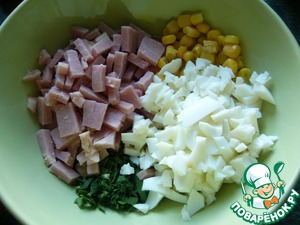 Нарезать мелко ветчину, яичные белки, зелень. Добавить кукурузу