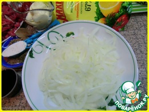Лук нарезать полукольцами. Добавить сахар и замариновать с уксусом