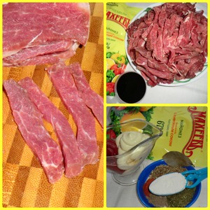Мякоть говядины нарезать тонкими брусочками, (толщ 0,5 см)