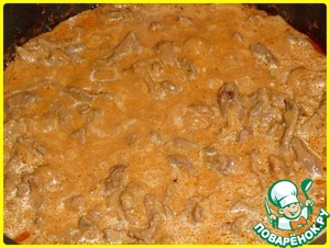 Теперь заливаем мясо соусом и тушим, (пока опять) не выпарится влага - наполовину.