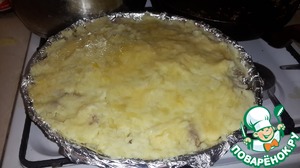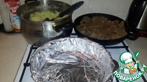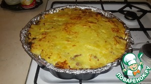 • Наложить слой пюре в форму, далее слой фарша и сверху оставшееся пюре. Смазать взбитым яйцом. И запекать около 30 минут, пока не появится корочка.