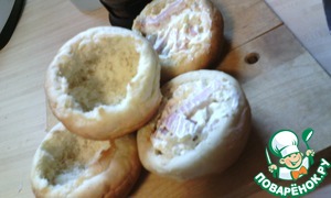 Из булочек вынимаем внутренности и заправляем смесью из сыра и ветчины.