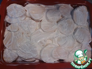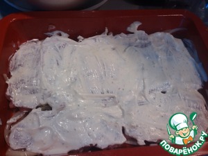 Смешиваем сметану майонез, добавляем раздавленный чеснок, соль, перец по вкусу, хорошо размешиваем. Половину соуса выкладываем на мясо.