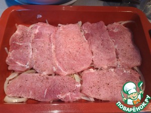 Свинина (у меня балык) нарезаем на куски 1-1,5 см, отбиваем, солим перчим по вкусу, выкладываем на лук. -