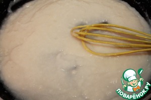 К раскаленному растительному маслу добавляем муку, быстро перемешиваем, добавляем бульон и снова тщательно перемешиваем. Оставляем на слабом огне на несколько минут.