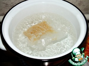 Рис отвариваю в подсоленной кипящей воде до готовности. Затем вытаскиваю с помощью вилочки, аккуратно разрезаю пакетик, рис выкладываю на тарелку